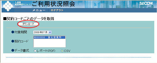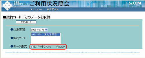 - ◆ 選択できるデータ書式は、「レポート(PDF)」と「CSV」形式です。